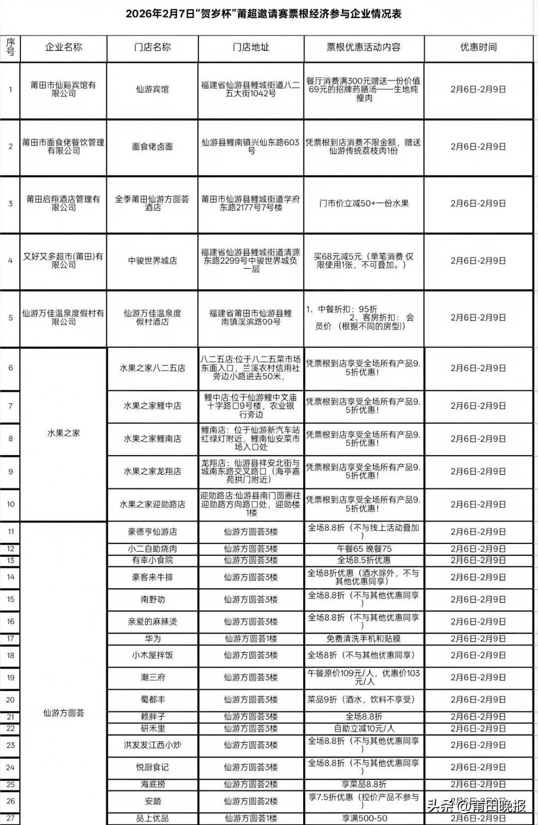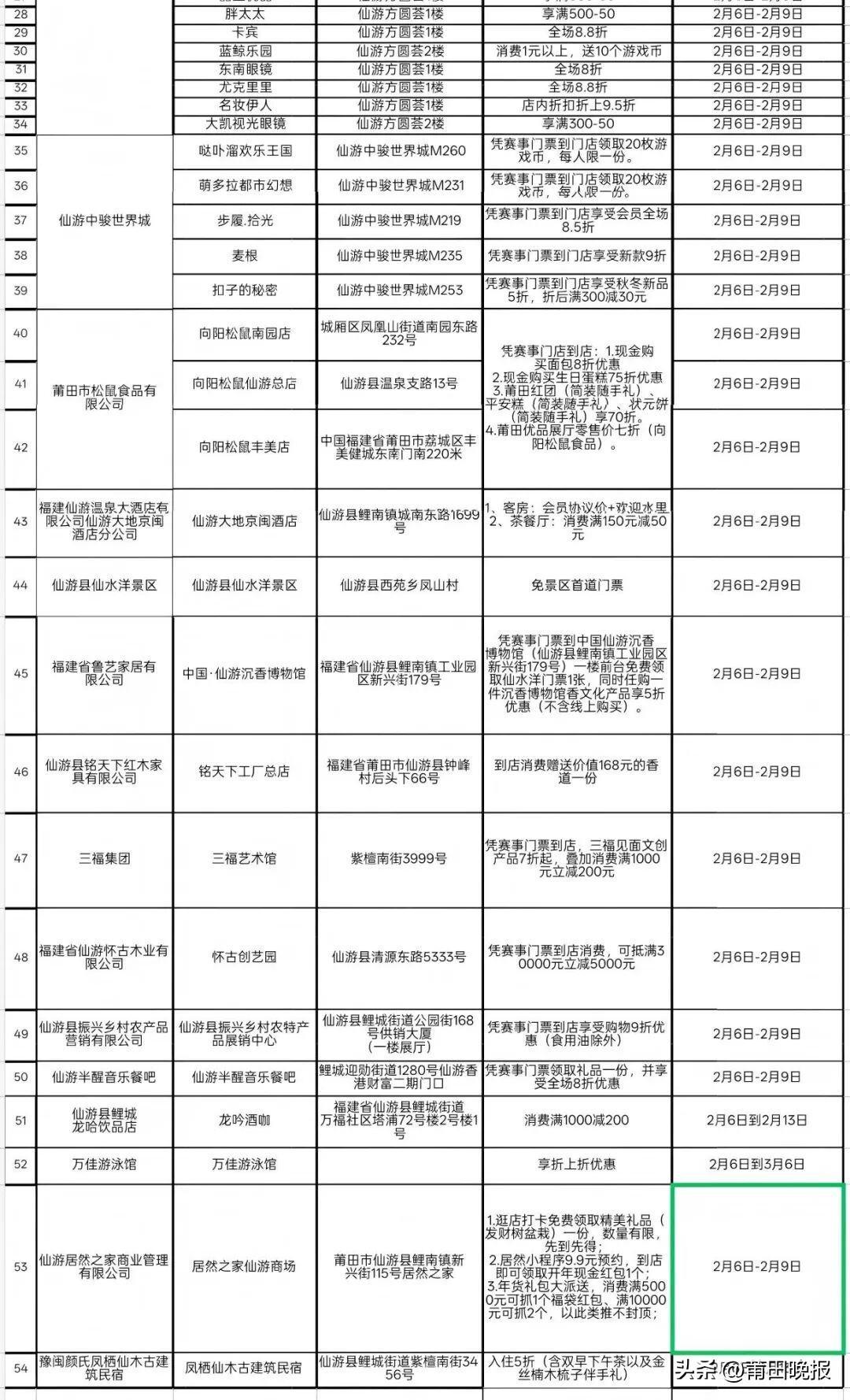 全城优惠:可在仙游县内54家合作商户(涵盖餐饮、购物等)享受专属折扣,具体列表详见推文内表格。